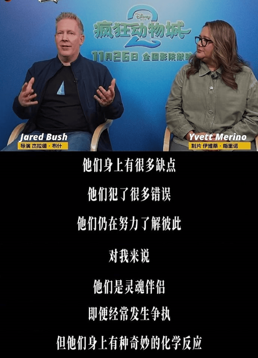 在采访中,导演杰拉德·布什也对狐兔的感情给出了官方定义:“他们身上有很多缺点,他们犯了很多错误,他们仍在努力了解彼此。对我来说,他们是灵魂伴侣,即便经常发生争执,但他们身上有种奇妙的化学反应。”