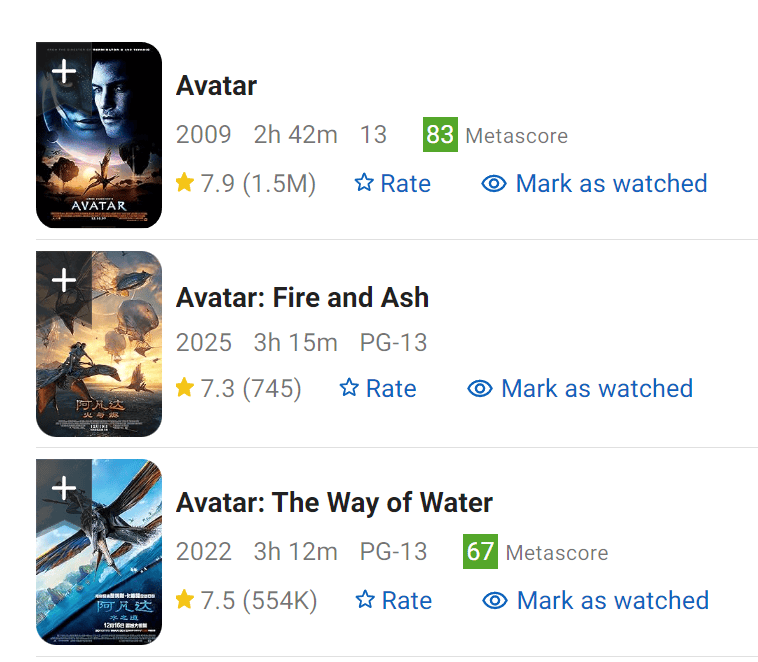 《阿凡达》系列三部作品,在IMDb的评分依次为7.9、7.5和7.3,显然没跳出这个困局。回想当年《阿凡达》上映,确实起点太高了,给全球观众带来惊艳的视觉奇观,仿佛让古代人突然见到了智能手机。