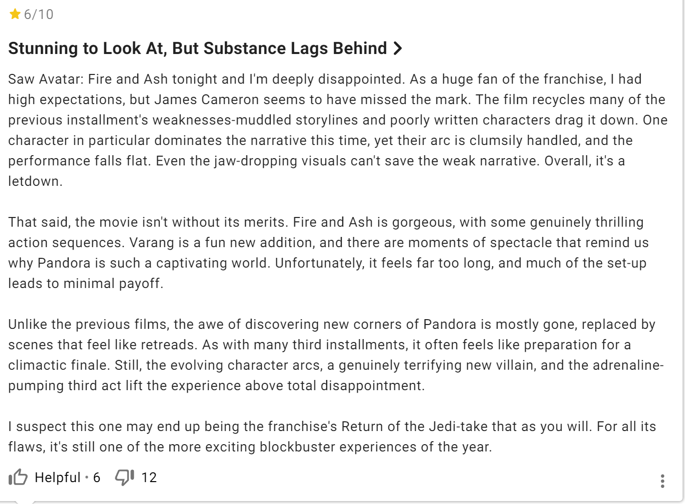2025年全球电影创作都陷入低潮,几乎没有什么像样的大片,所以这位观众在最后还是给了《阿凡达:火与烬》比较正面的总结评价: