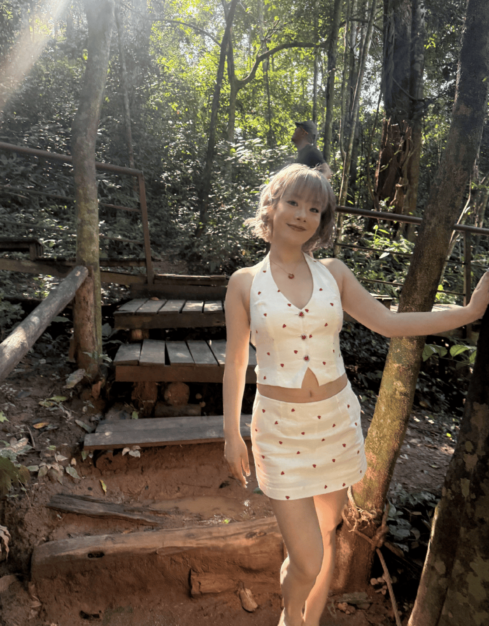 王菊立于林间木阶旁,随性自在。