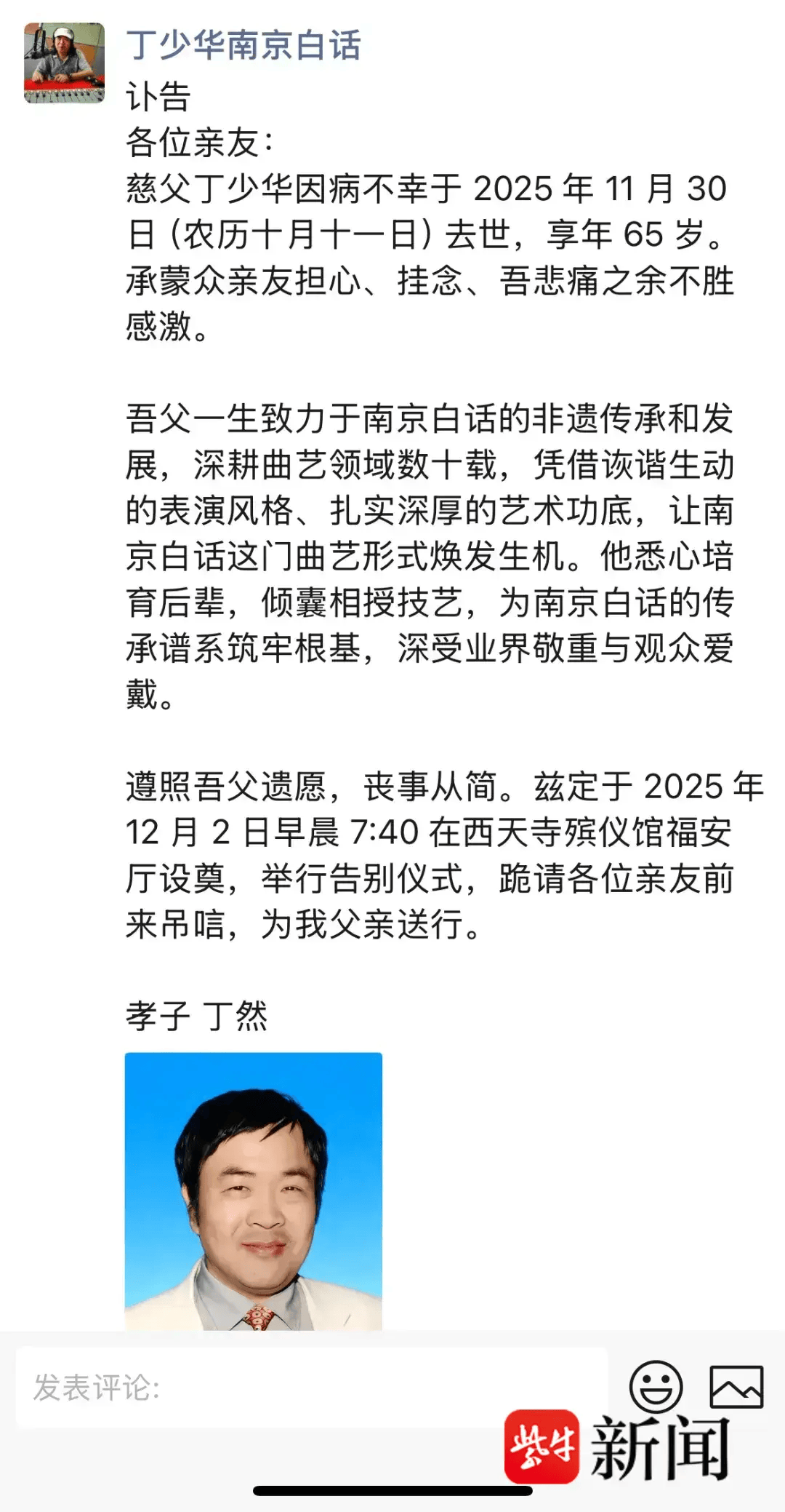 丁然表示,“父亲一生致力于南京白话的非遗传承和发展,深耕曲艺领域数十载,凭借诙谐生动的表演风格、扎实深厚的艺术功底,让南京白话这门曲艺形式焕发生机。他悉心培育后辈,倾囊相授技艺,为南京白话的传承谱系筑牢根基,深受业界敬重与观众爱戴。遵照吾父遗愿,丧事从简。兹定于 2025 年12 月 2 日早晨 7:40 在西天寺殡仪馆福安厅设奠,举行告别仪式。”采访中,他告诉记者,“昨天早上突发脑梗,之前也曾脑梗过。”