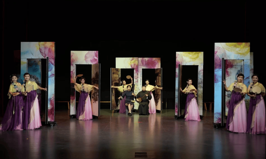 舞台上,光影变换,一身着传统长衫、娓娓道来的说书人,配合演员们生动的演绎,将观众带回一段红桥百姓生活的旧时光。一语毕,她一个优雅的转身,身影在光影中模糊,屏风移动翻转,时空换了容颜,仅仅3秒,演员们长衫褪去,一袭华服推门而出,清亮的曲调再度响起,宛若魔法。
