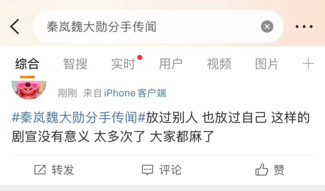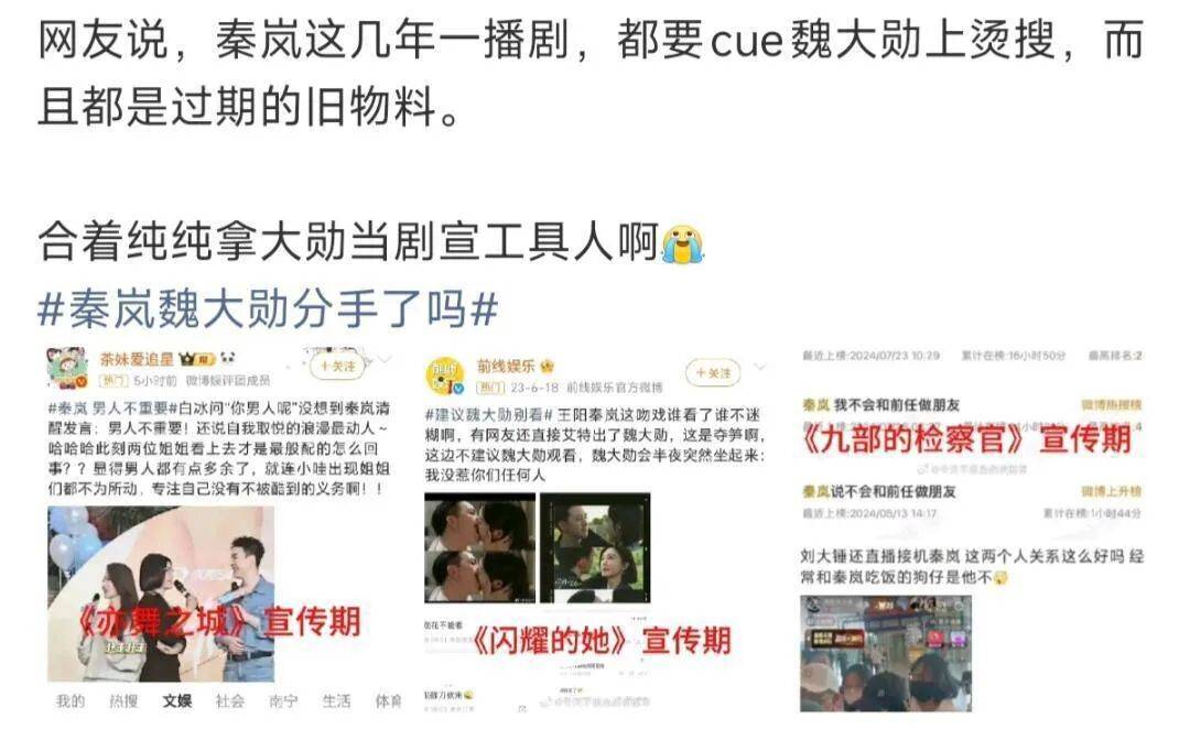 因为秦岚新剧播的不算太好,魏大勋粉丝觉得秦岚这是又一次拿分手话题博热度。