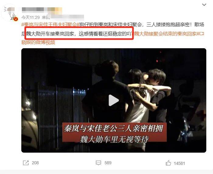 今年六月份,秦岚去和小宋佳夫妻俩聚会,晚上结束后是魏大勋和他爸爸开车接的秦岚。