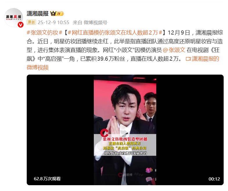最近,直播圈被一股“明星仿妆团播”的风潮刷屏了。简单说,就是一群模仿者组团,靠高度还原明星造型进行集体表演直播。而在这股热潮里,一位名叫“小颂文”的网红,靠着模仿演员张颂文在《狂飙》中的“高启强”一角,火速收割了39.6万粉丝,单场直播在线人数轻松突破2万,成了现象级话题。