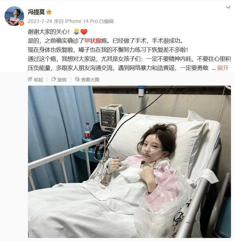 2023年7月,冯提莫发文透露确诊甲状腺癌,已完成手术,表示嗓子恢复差不多。“通过这个癌,我想对大家说,尤其是女孩子们:一定不要精神内耗,不要往心里积压负能量,多跟家人朋友沟通交流,遇到网络暴力和造黄谣,一定要勇敢的说出来并且拿起法律的武器保护自己。不要担心哦,之后我还要给你们唱歌呢,并且不久后我们就会见面啦,你还会来听吗?只要你听,我就会一直唱下去!”