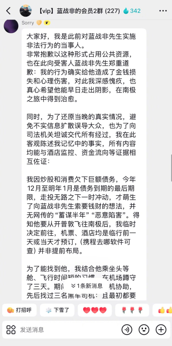 这个人,出现在了蓝战非的粉丝群里,然后这个人就向大众发布了“蓝战非南非被绑架事件”的疑似经过: