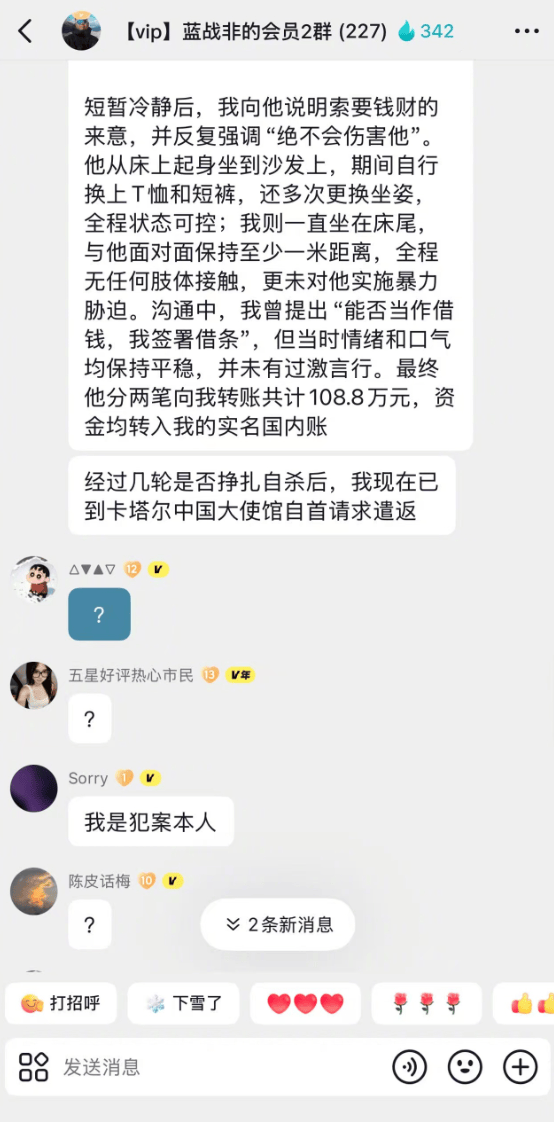 可以看到,这个人在描述里称,自己因为炒股和消费欠下巨额债务,而且还债期限要到了,所以一时冲动,就想跟蓝战非索要钱财,于是发生了这个案件。但是案件的经过,这位自称当事人说的,和蓝战非说的则是几乎不一样。