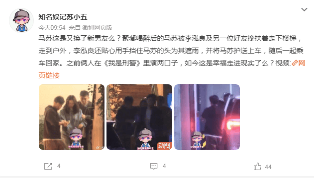 在视频里,马苏和演员李泓良聚餐后一起回家,期间马苏像是喝碎了,李泓良一直贴心照顾她。