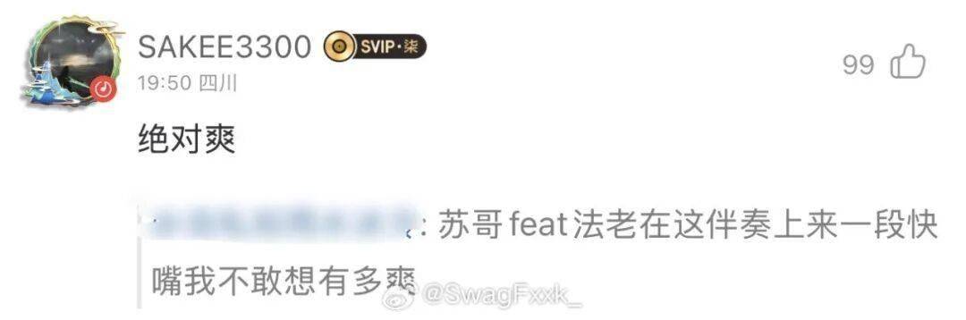 有网友提出杨和苏feat法老在同样的伴奏上来一段快嘴,Sakee对此回复:“绝对爽”