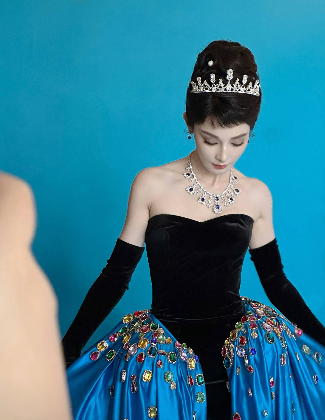 彭小苒头戴精致皇冠,身着黑丝绒抹胸裙。
