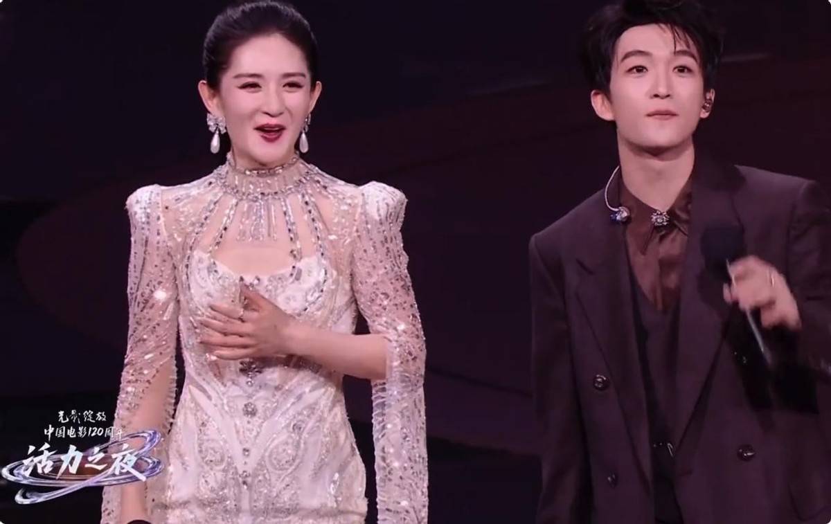 当电影频道的活力之夜开始时,谢娜一出场就吸引了所有人的目光。她穿着一件满是闪亮碎钻的礼服,勾勒出她修长的身形。高高的马尾发型让她精致的五官完全展现出来,礼服在灯光下闪烁着细碎的光芒,而她那双标志性的笑眼,瞬间给人一种典型晚会主持人的感觉。