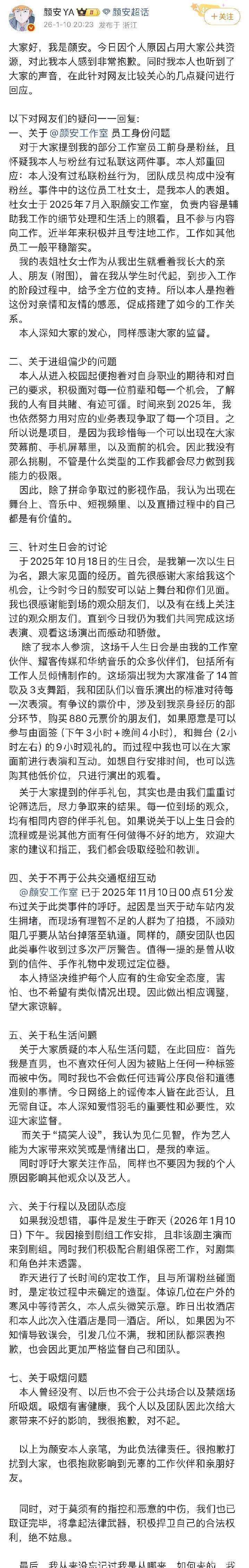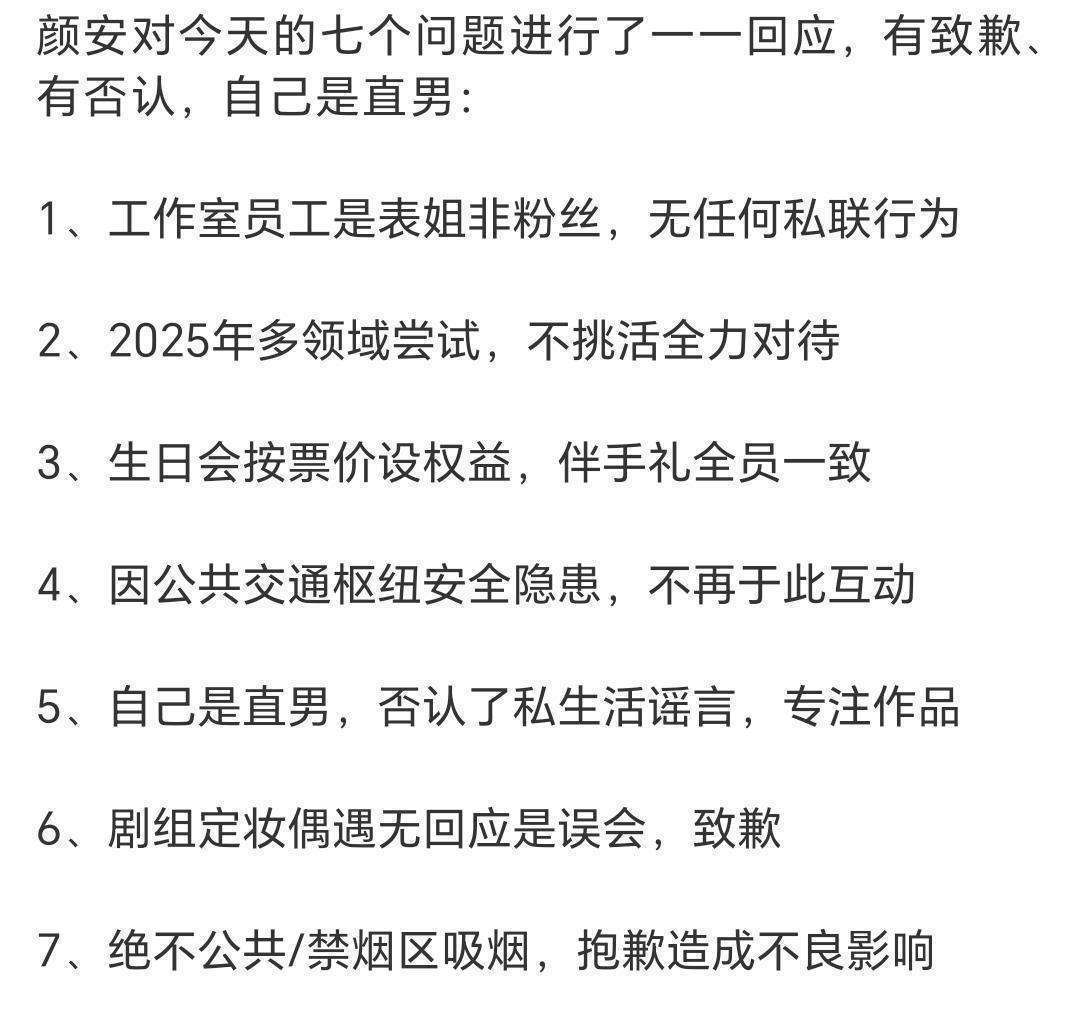 首先,关于团队聘用私生饭作为助理一事,颜安澄清了事情的真相。他指出,所谓的私生饭并非粉丝,而是他的亲表姐。自2025年7月起,她便加入了工作室。实际上,表姐自小便在他身边陪伴成长,了解他的生活和工作方方面面。聘用她完全是基于亲情的考虑,而非涉及任何私联粉丝的行为。颜安情真意切地解释,希望外界能够理解。