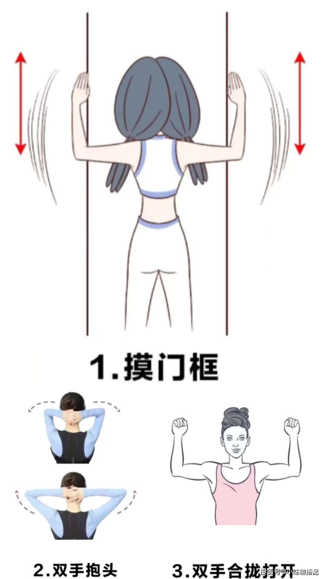 第一个动作就是摸门框,肩膀和门框齐平并上下摸;第二个动作双手抱头,手和肩膀持平并如蝴蝶煽动翅膀一样开合手臂,让背部有紧绷感。