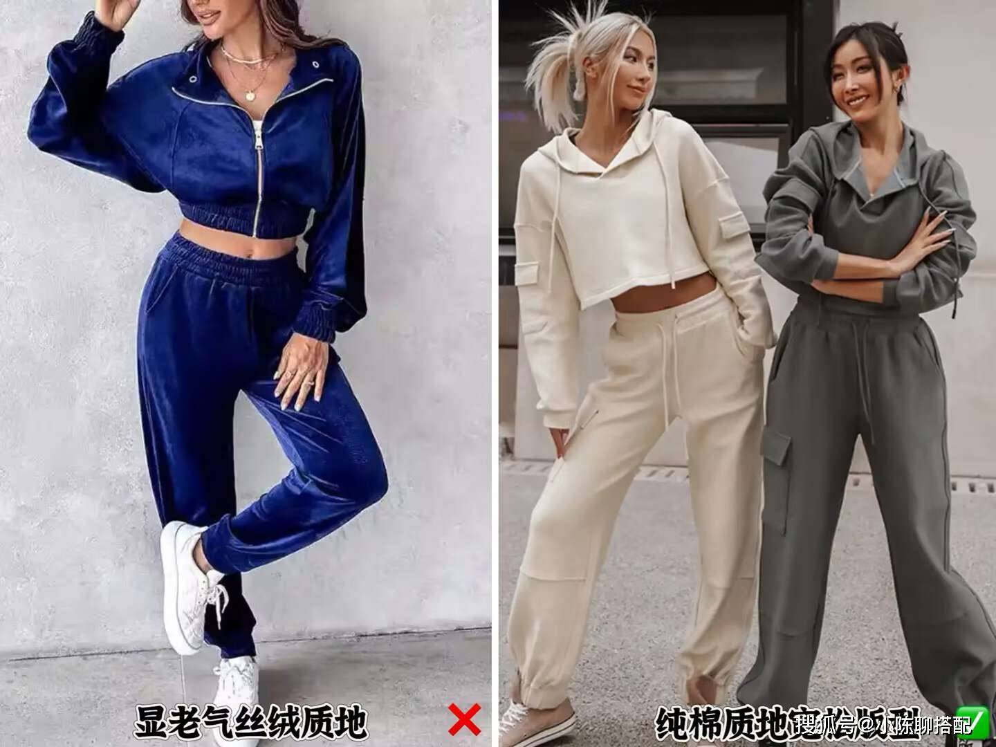 穿运动套装时,尽量选择纯棉材质宽松版型的,远离显老气的丝绒材质,闷汗又不好看,颜色上也不要选择饱和度高或暗沉的服装,更推荐浅色系的套装看着清爽又减龄。