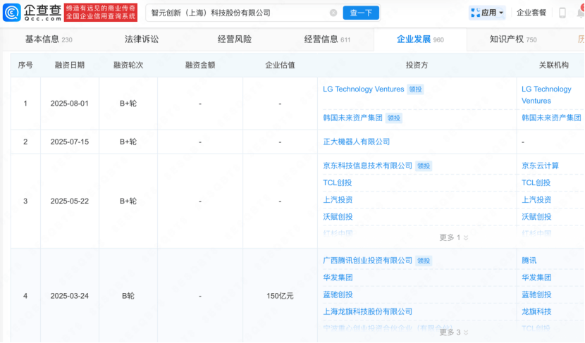 2025年3月,在A轮阶段徘徊一年半、融资六次的智元,终于迈入B轮融资,由腾讯领投,投后估值150亿元。半年内,智元连续完成四次B轮融资,成为和宇树一样行业里的第一梯队。