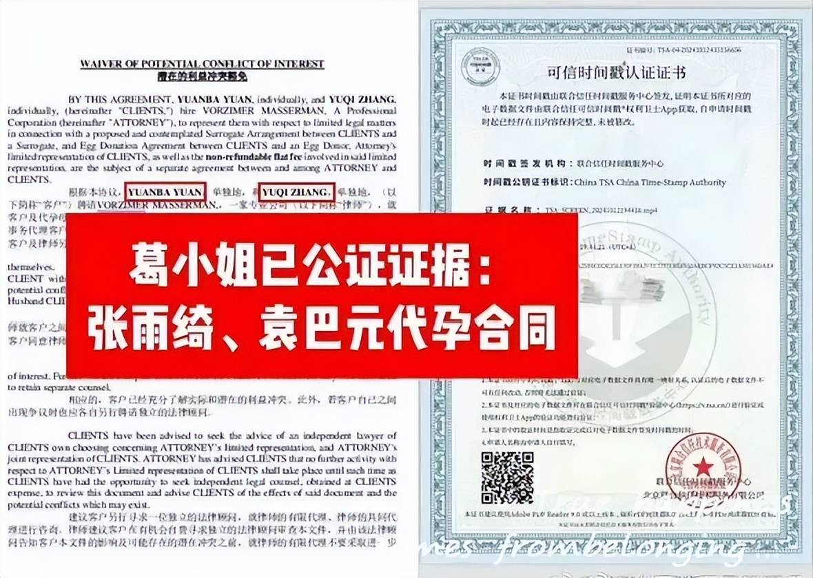 此前,葛晓倩晒了张雨绮和袁巴元两人代孕相关的文件,且经过公证,当中两个孩子都出生于2017年,但日期相差三个月。这与张雨绮对外透露生的双胞胎消息不一致,若是被冤枉,以她那么火爆的脾气早该主动澄清了,不知为何沉默。