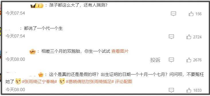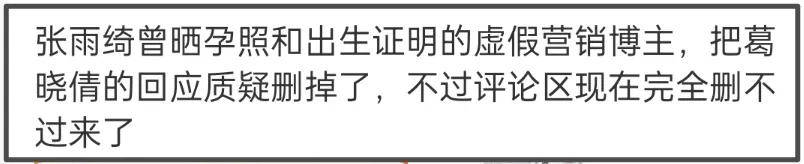 许是葛晓倩的回应太有底气,该澄清博主直接把葛晓倩的评论删除了,但是评论区还是质疑声一片,根本删不过来,大部分网友表示网传“一个代孕,一个自己生”,“出生证明一个七月一个十月”,让张雨绮快点出来澄清。