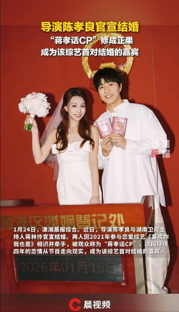 这对新人选择在2026年1月24日,通过社交媒体向大众公开婚讯,配文从喜欢你到一辈子喜欢你,同时晒出结婚证和登记现场的照片,甜蜜感几乎溢出屏幕。两人的故事,要从2021年那档恋爱综艺《喜欢你我也是》第三季说起。节目中,来自内蒙古的导演陈孝良与湖南卫视甜美主持蒋林伶相遇,他们在镜头前互动的化学反应异常亮眼,被观众亲切地冠名蒋孝话CP,并最终牵手成功,把节目里的浪漫延续到了现实生活中。然而,要从荧幕情侣走向现实夫妻,他们一路走了整整四年。这份坚持与真心,也让他们创造了一个纪录:成为《喜欢你我也是》开播以来,首对真正步入婚姻殿堂的嘉宾。这无疑给所有追过节目的嗑学家们注入了一针强心剂——原来综艺里的甜蜜,真的有机会酿成现实的幸福。