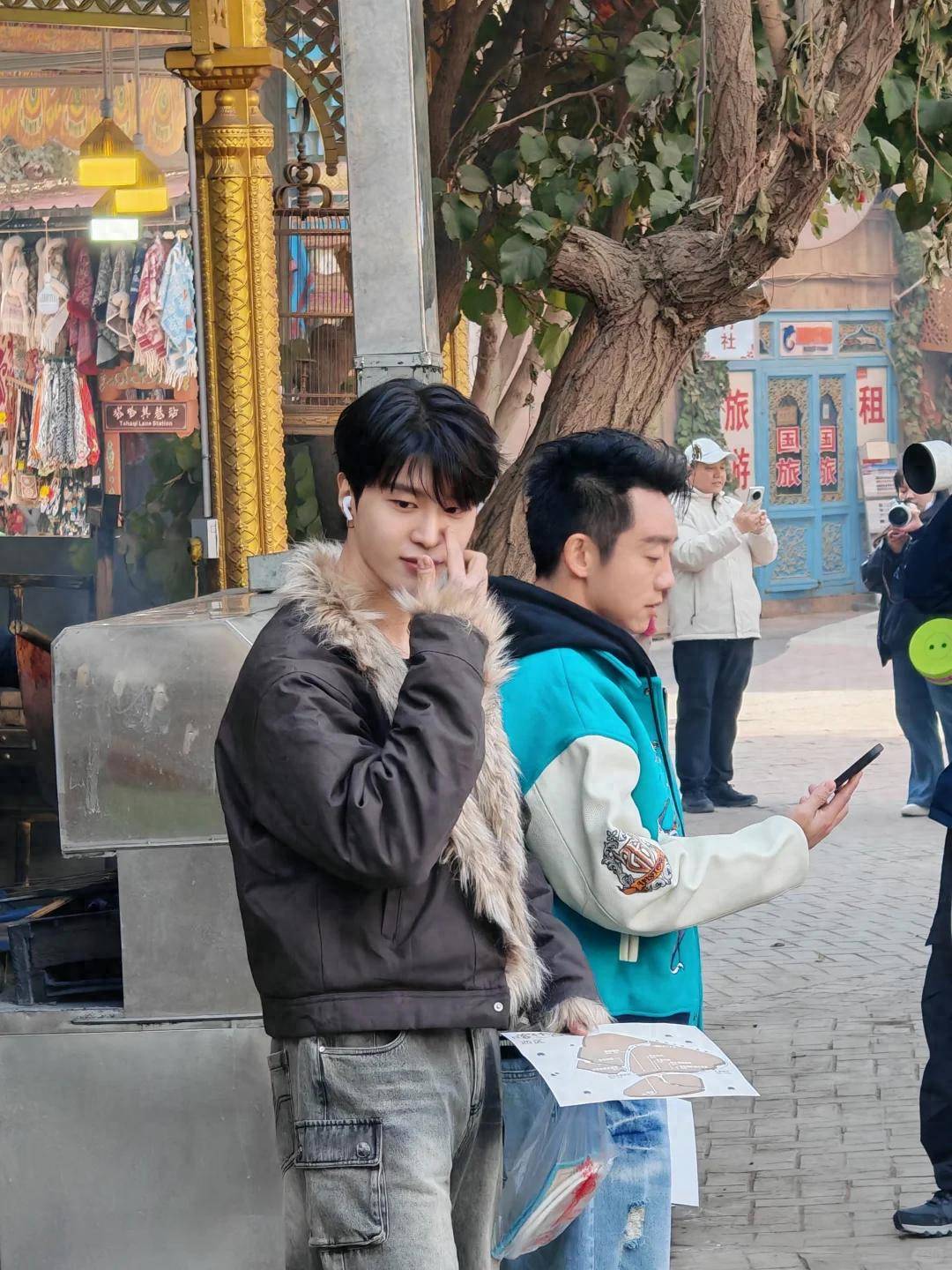 没有亮眼的造型,没有刻意的镜头前互动,他裹着一身全黑休闲装,鸭舌帽压得很低,口罩几乎遮了半张脸,连裤脚都松松垮垮垂在地上,沾了些地面痕迹——远看混在工作人员里都难分辨,走近才认出是那个综艺里爱耍宝、能接梗的他。