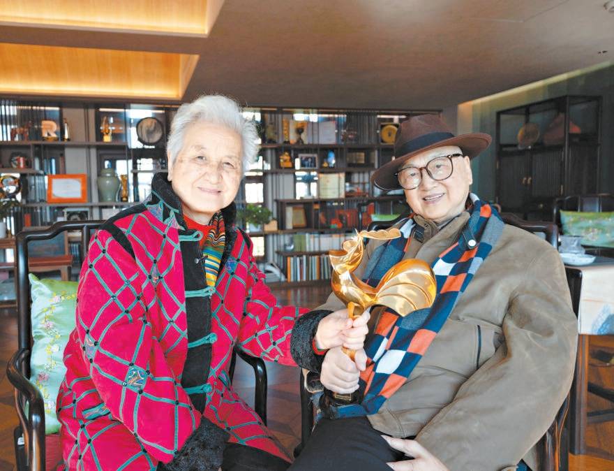 手捧金鸡奖的乔榛和妻子唐国妹。杨帆摄