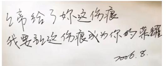 他给李嫣写下了这么一句话:上帝给了你这伤痕,我要让这伤痕成为你的荣耀。