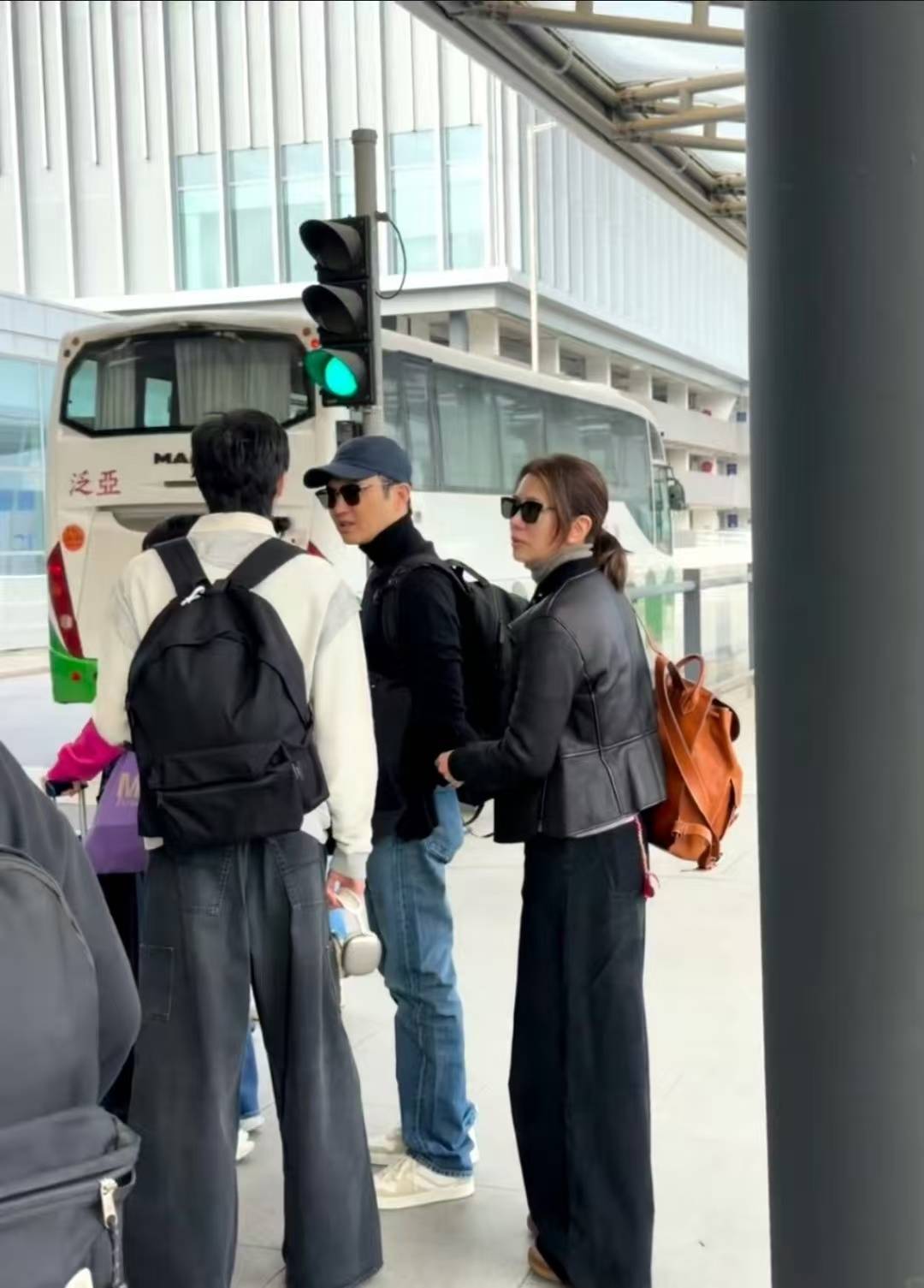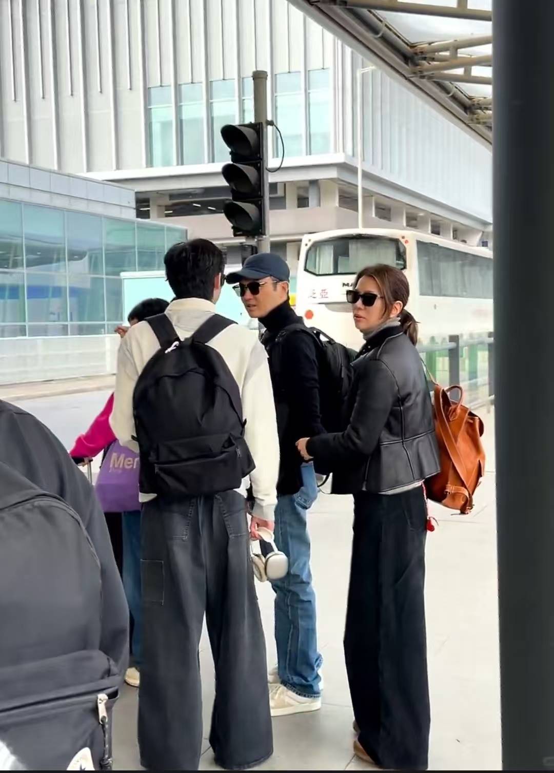 张智霖、袁咏仪与李承铉在机场外等候,身后大巴车停靠。