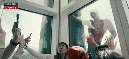 在大楼内外,有数千名观众围观,Alex的一举一动都备受观众,甚至引起欢呼。