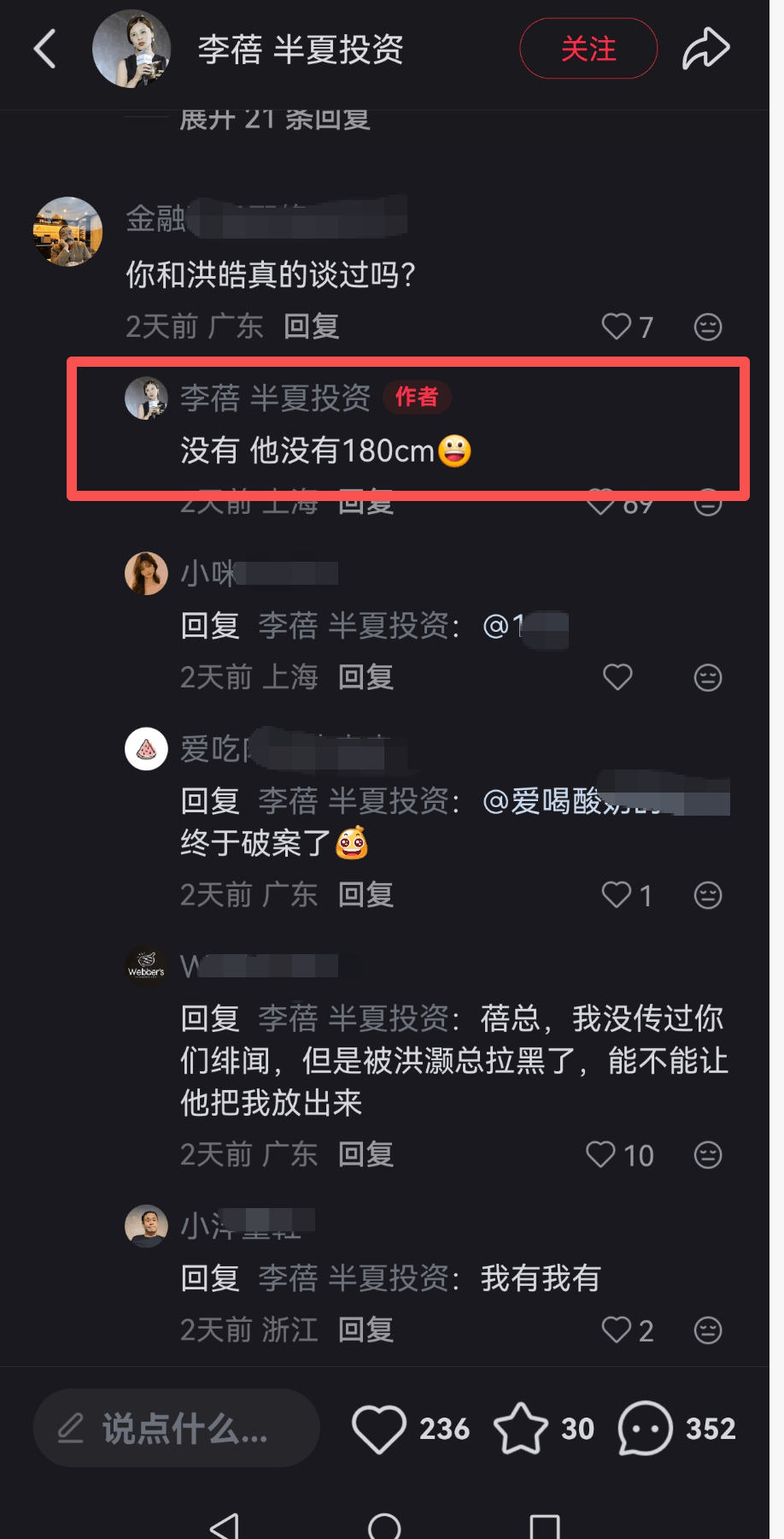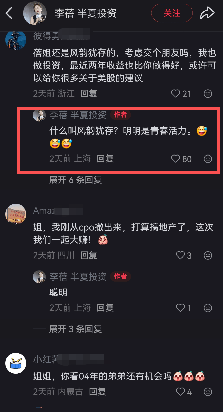 有一位网友不会说话,直接来一句:“蓓姐还是风韵犹存,考虑交个朋友吗”,不过后面则是自夸自己投资比李蓓好。