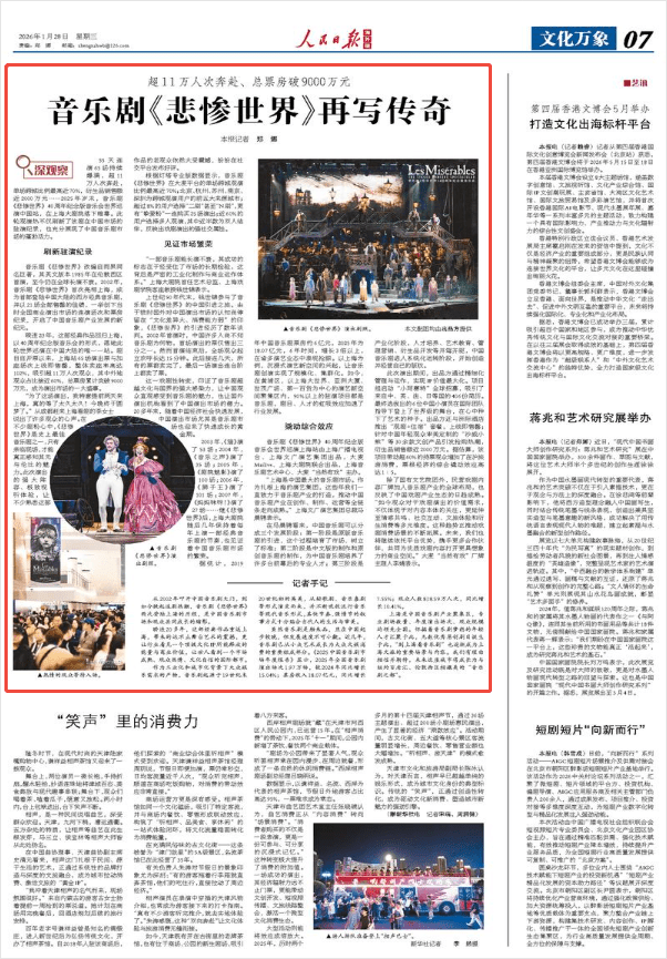 上海是中国音乐剧产业聚集区,专业剧场数量、年度演出场次、观众规模均领先全国。怀揣着音乐剧梦想的年轻人才汇聚于此,无数优秀原创剧目诞生于此,“到上海看音乐剧”也逐渐成为上海文旅的重要场景与内容。我们有理由相信并期待,未来这座城市将成长为与纽约百老汇、伦敦西区相媲美的“音乐剧之都”。(本报记者 郑娜)
