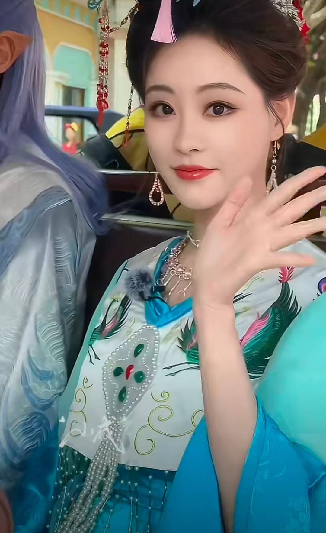 祝绪丹蓝羽发饰衬得灵动娇俏。