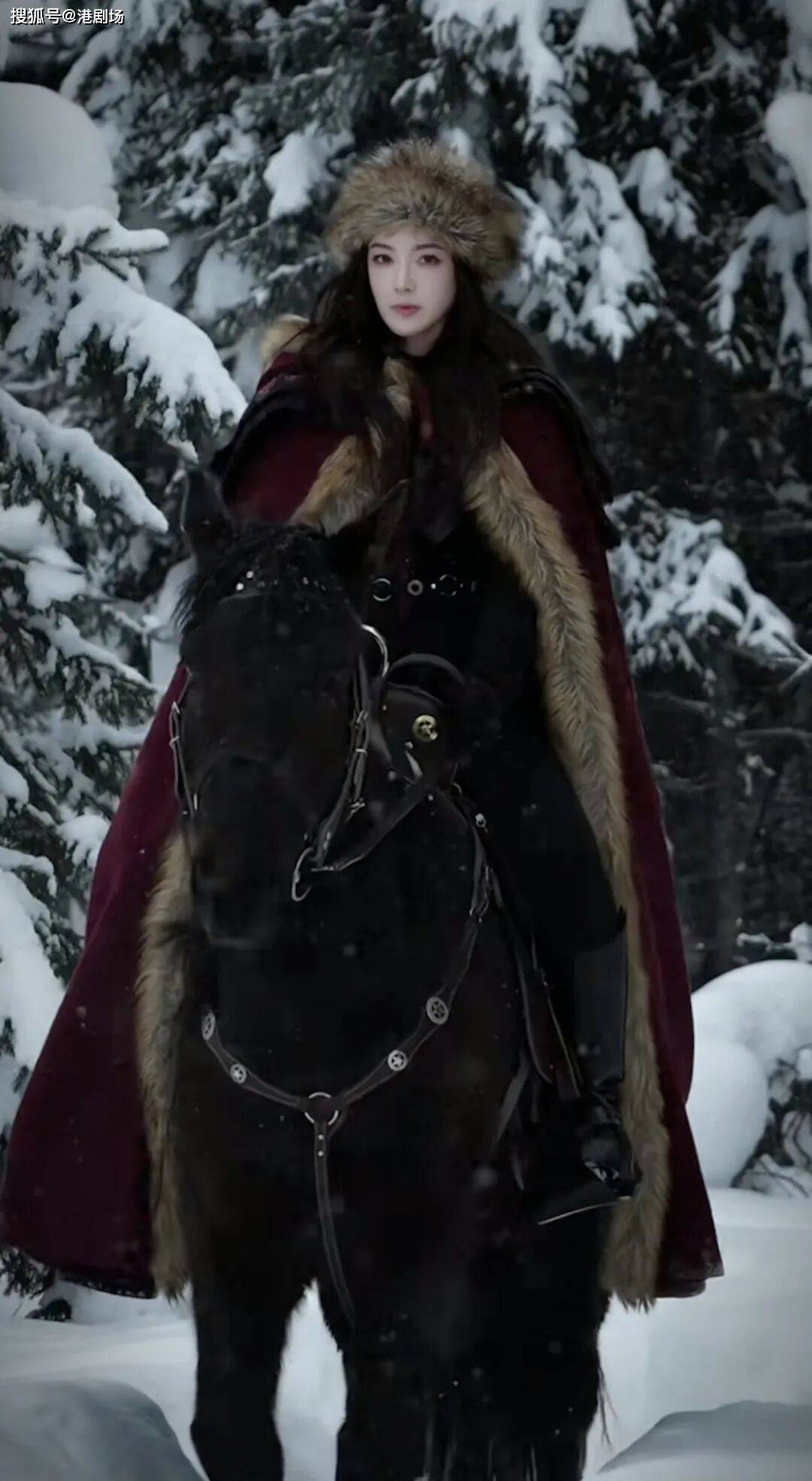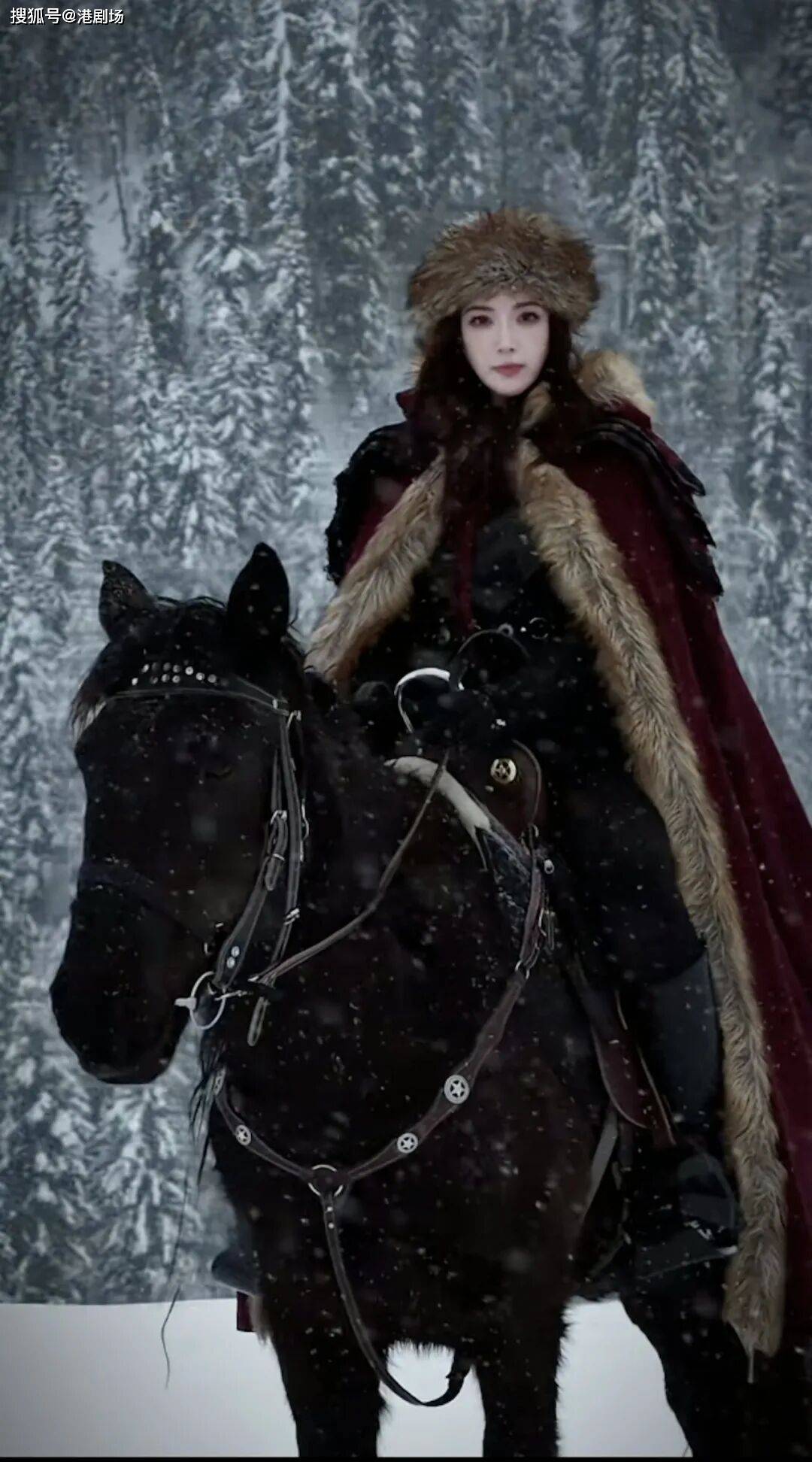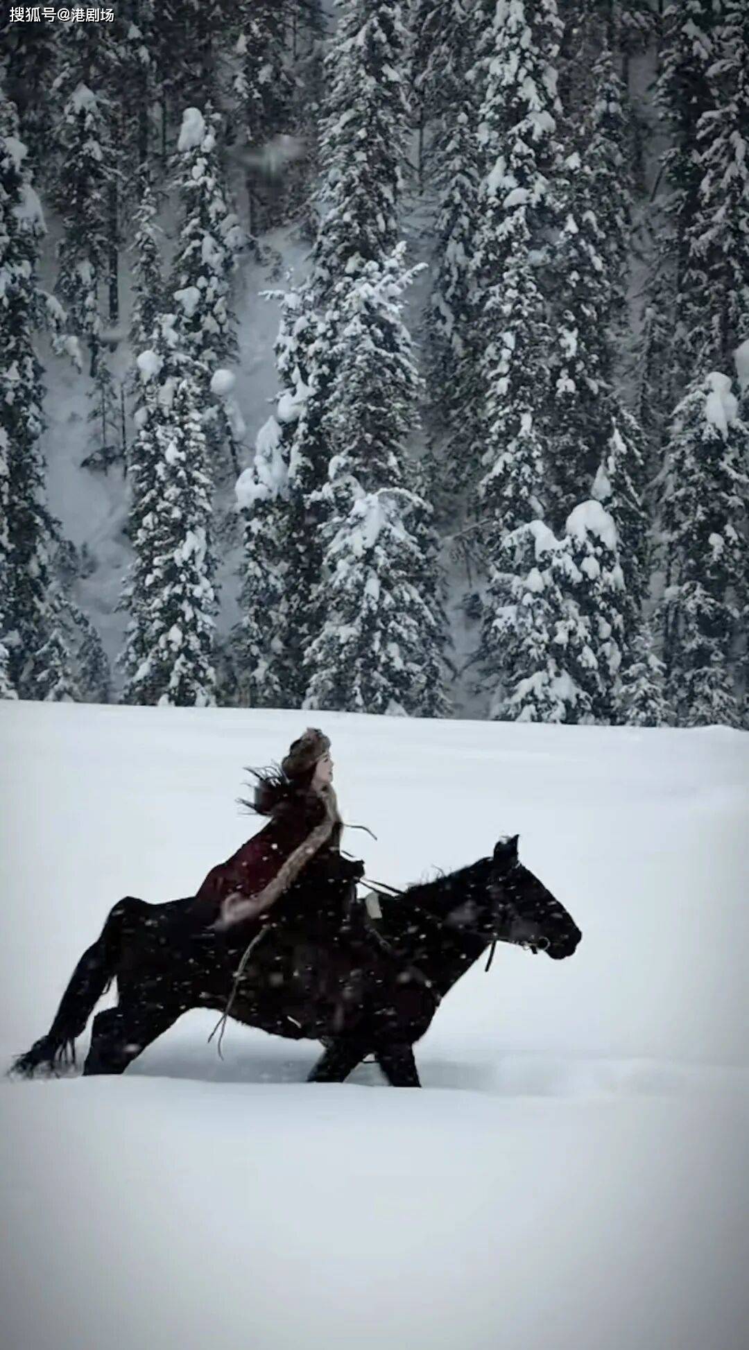 画面中,大雪纷飞的野外森林里,她策马奔驰,又靓又型,尽显飒爽气质。
