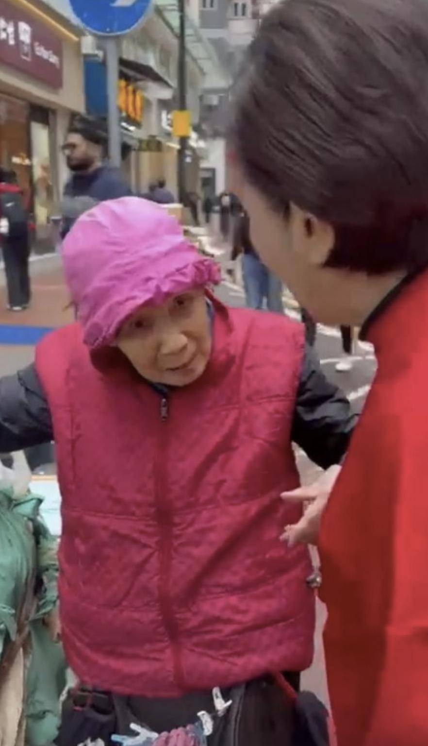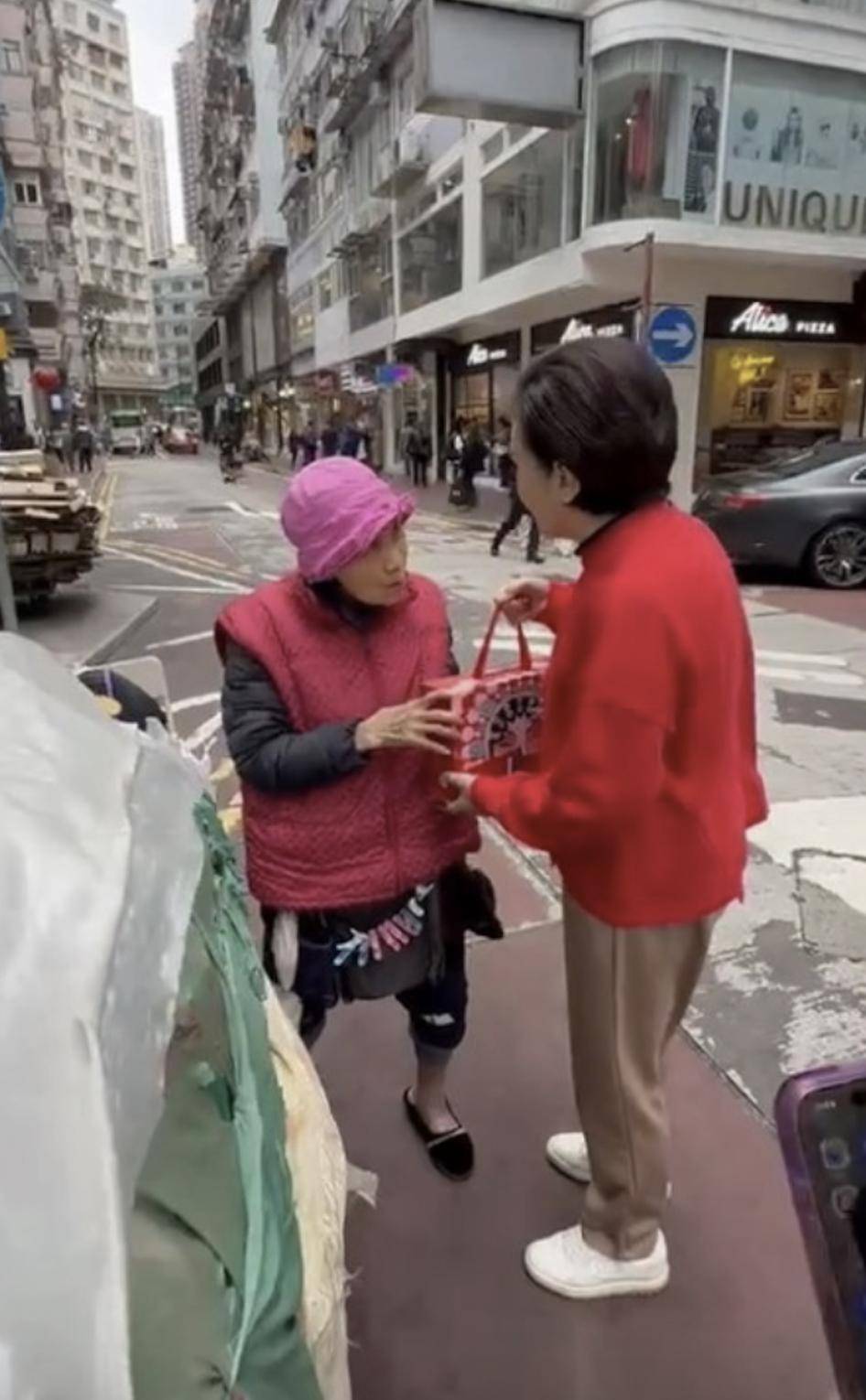 从视频可见,汪明荃独自现身铜锣湾,当天她身穿了红色的上衣,卡其色的长裤,一头的黑发,看起来显得年轻且精神。她现身的时候街上的人并不多,只见她手提着一袋自家出品的萝卜糕走向一位正准备在街边开摊的老人家。这位老人家身形消瘦,背部还有点驼背,穿着黑色的棉服,红色的马甲,头戴一顶粉色的帽子,袜子也没穿。老人家在自己的摊档前忙乎着,正准备要开摊。