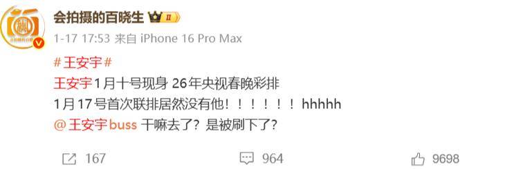 细看他对其他几个节目成员同样有恶意,王安宇第二次春晚联排没被拍到,狗仔就直接猜测说他是被刷下去了。