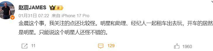 知名球员经纪人赵震在官方出通报之前,就发了个帖子,流露出支持金晨的口风,认为单纯从她亲自开车载助理这件事情上,就能看出她人还挺好。