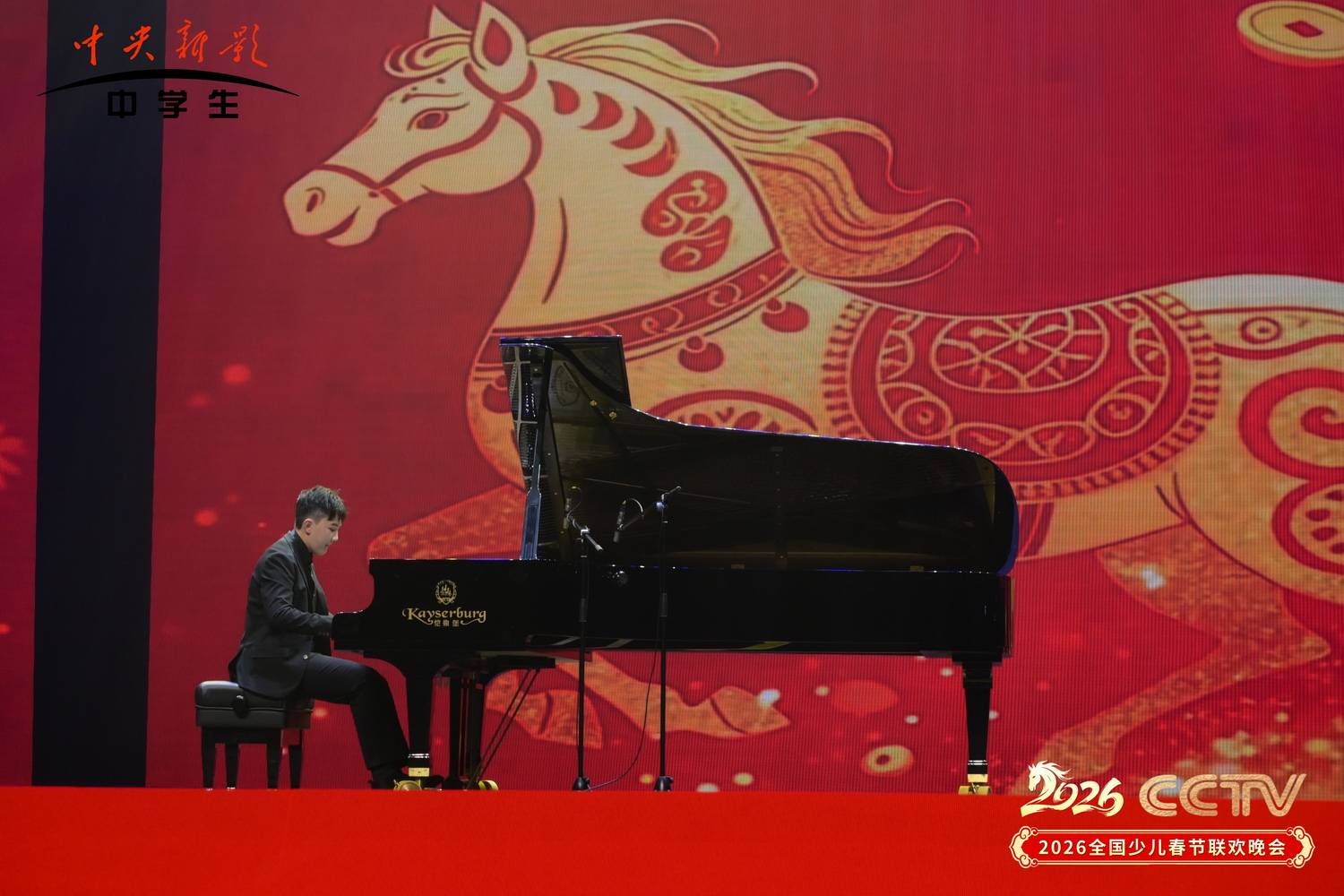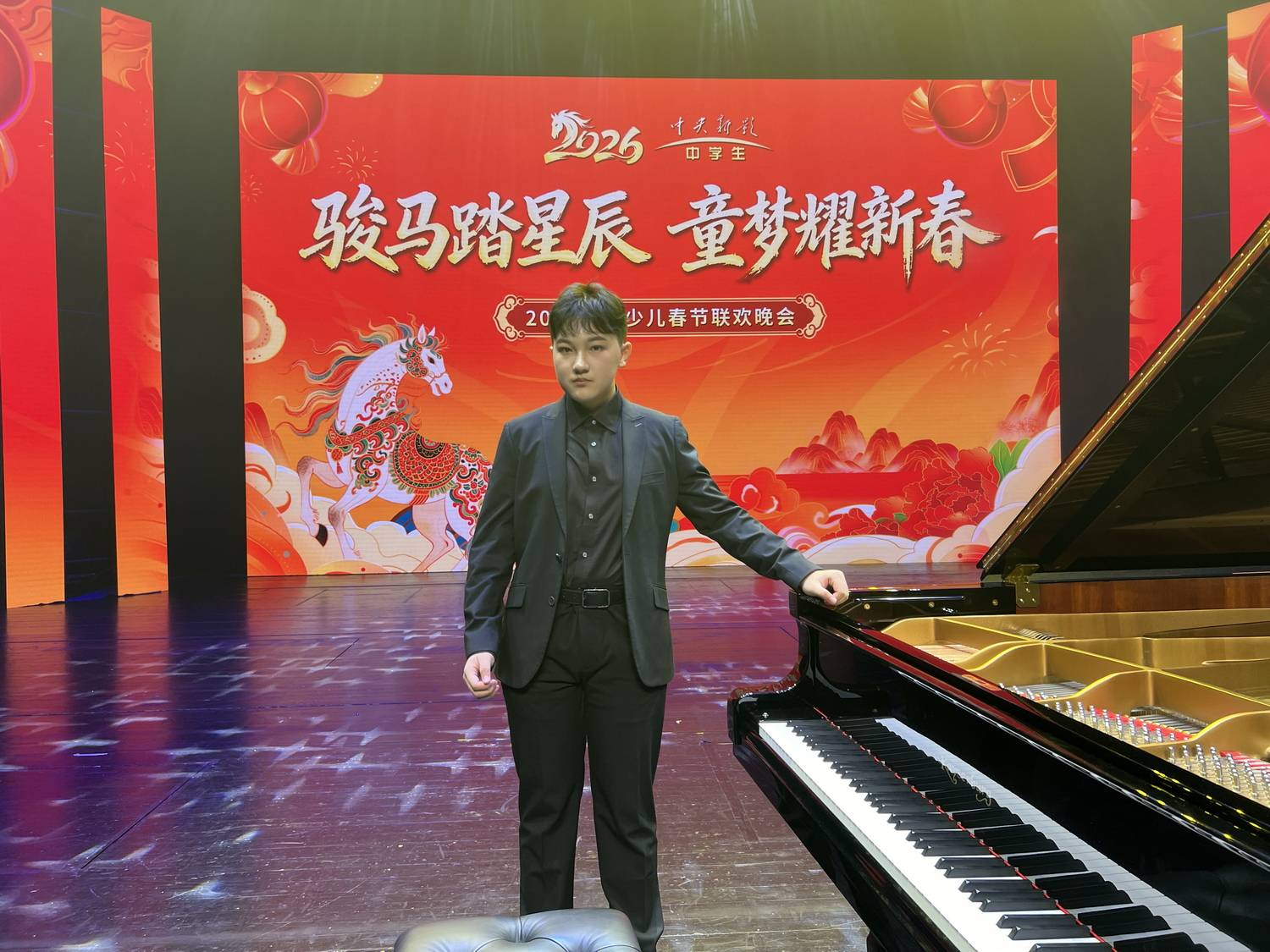 珠江口畔,日月同辉;琴音悠扬,共贺新春。2月3日,2026中央新影中学生频道“骏马踏星辰,童梦耀新春”全国少儿春节联欢晚会在珠海日月贝大剧院圆满完成录制。这座中国唯一建在海岛上的艺术殿堂,在此刻见证了来自全国各地的音乐少年用艺术致敬新春的喜悦。其中,来自香港的少年钢琴家廖偲楷受邀作为主会场嘉宾登台,以一曲融合《春节序曲》与莫扎特《爵士幻想曲》的钢琴独奏,为晚会注入跨越古今、联结粤港澳的新春暖流。