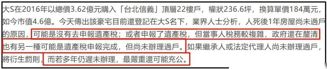 据悉,大S生前曾经购买了一套豪宅,价值不菲,而这套豪宅也成为了遗产继承争夺的焦点之一。此外,大S的遗产问题还涉及到她的名下是否还有其他的财产,以及她的遗产税问题,这些都成为了外界关注的热点话题。