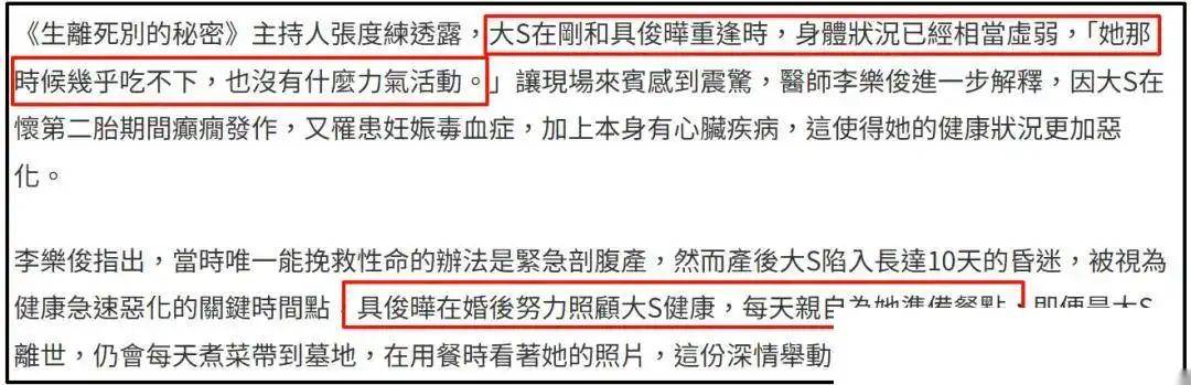 就在近几日,具俊晔参与了一档韩国综艺节目,在节目中,他意外曝光了大S的健康状况,称大S生前一直有一些健康问题,需要定期去医院进行检查和治疗。具俊晔的这一言论引起了外界的热议和猜测,大家纷纷猜测大S的健康状况究竟如何,她的离世是否与健康问题有关。