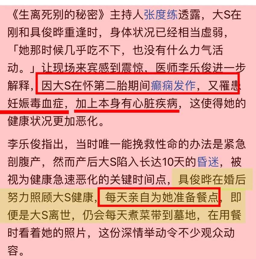 在这档节目,主持人称赞具俊晔是一个顾家的好男人,比如大s生下孩子之后,身体状况一直很差,根据具俊晔再婚之后,甚至有一段时间都下不来床,而作为丈夫,具俊晔则负责照顾妻子的饮食起居,不仅每天变着法样做饭,还会抱着大s去厕所,说实话,这套流程跟现在韩国热门的偶像剧,也没有什么差别
