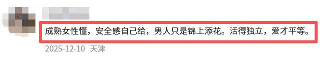 再说秦岚,她的底气也不是凭空而来。为了爱情,她曾付出代价,也渴望过家庭,但后来她选择专注事业,这些年从未停下脚步。今年她有三部作品《隐娘》《平等之门》《闪耀如她》蓄势待发,也正是这些积累,让她获得了生活与选择的自由。虽然在综艺中曾直面年龄焦虑,但最终她用实力和收入为自己赢得了充足的安全感。 这种成熟女性的生活态度,并非真的排斥爱情,而是不把爱情当成唯一依靠。对她们而言,真正的安全感,是银行卡里的余额,是随时可以开工的专业能力,是哪怕一个人也能把火锅吃成满汉全席的自在感。先把自己活成靠山,再去爱别人,让感情变得平等,这才是她们的人生态度。宝子们,你怎么看这件事?欢迎在评论区一起讨论,点赞三连,让更多人看到吧。 作者:花火;来源:头号文娱(ID:touhaowenyu),转载请联系文娱视野公众号。图片源于网络,如有侵权请联系删除。文章内容仅代表作者观点,不代表本公众号立场。