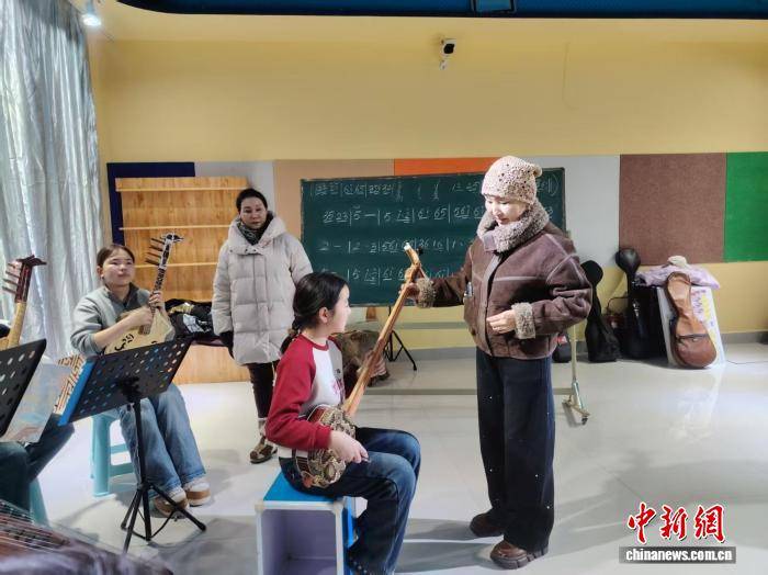 中新网记者连续多天跟访排练过程,发现每一天的排练都是一场手把手的现场教学。老艺人俯身指着乐谱,手扶着学生按弦的手,用脚尖轻轻打着拍子,低低跟着节奏哼着调。学生们眼睛盯着老艺人的指尖,扶着琴杆认真学,一遍遍打磨。阿斯尔的旋律,就在这一教一练里慢慢顺了、合了。