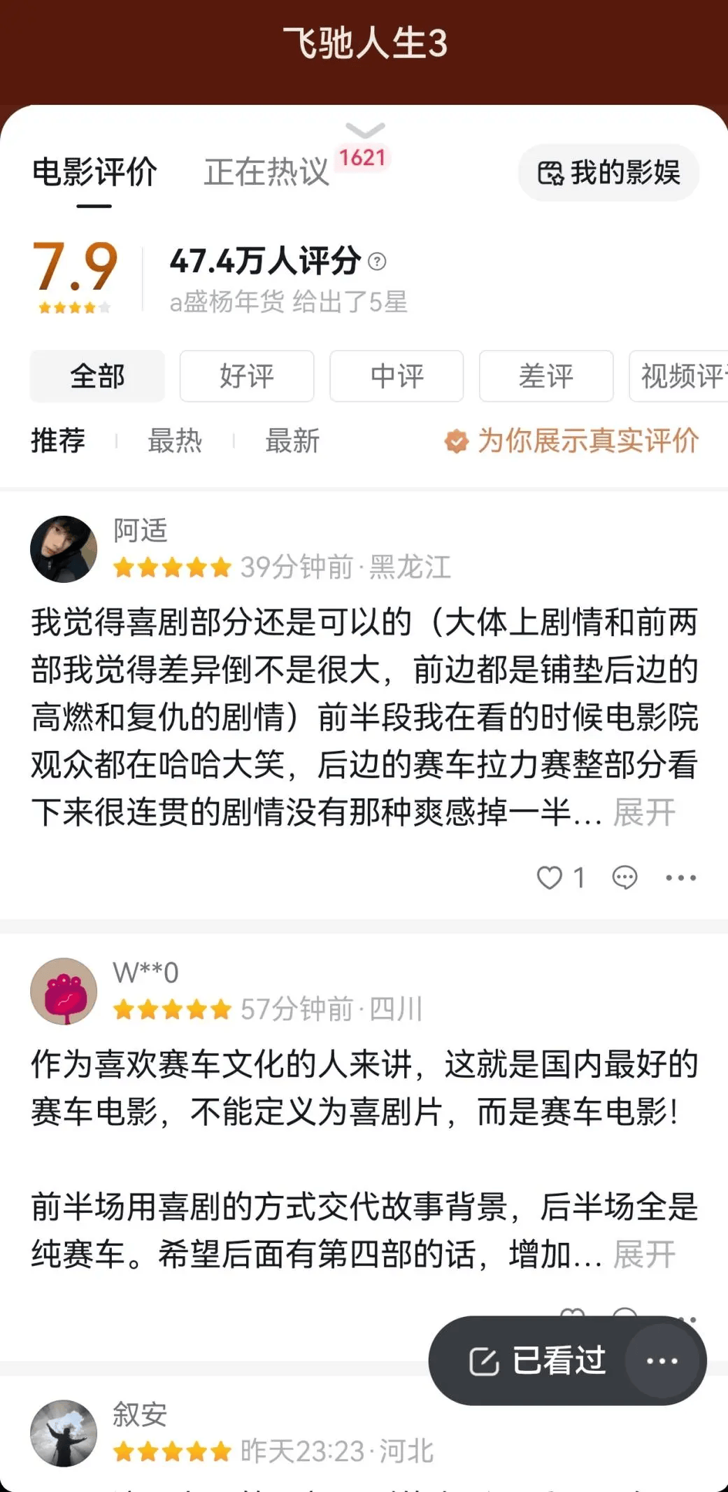 截至影片上映7天,抖音影视榜已清晰呈现出今年春节档的口碑梯度:《飞驰人生3》以7.9分、47.4万人参与评价的成绩稳稳占据榜首,话题#飞驰人生3口碑也是油门加满#热度高达798.4万,#沈腾飞驰人生3冠军车原型# 热度高达801.4万,诸多话题都让电影延续了系列IP的国民度优势,网友评论尽显认可:“本来是陪孩子来看沈腾的,没想到被赛车戏份燃到起鸡皮疙瘩,没有多余煽情,只有热爱与坚守,春节档最值的观影体验”“作为赛车迷必须夸,细节还原太到位,后半段的赛场名场面,音效和镜头感直接拉满,沈腾这次彻底跳出喜剧圈了”;
