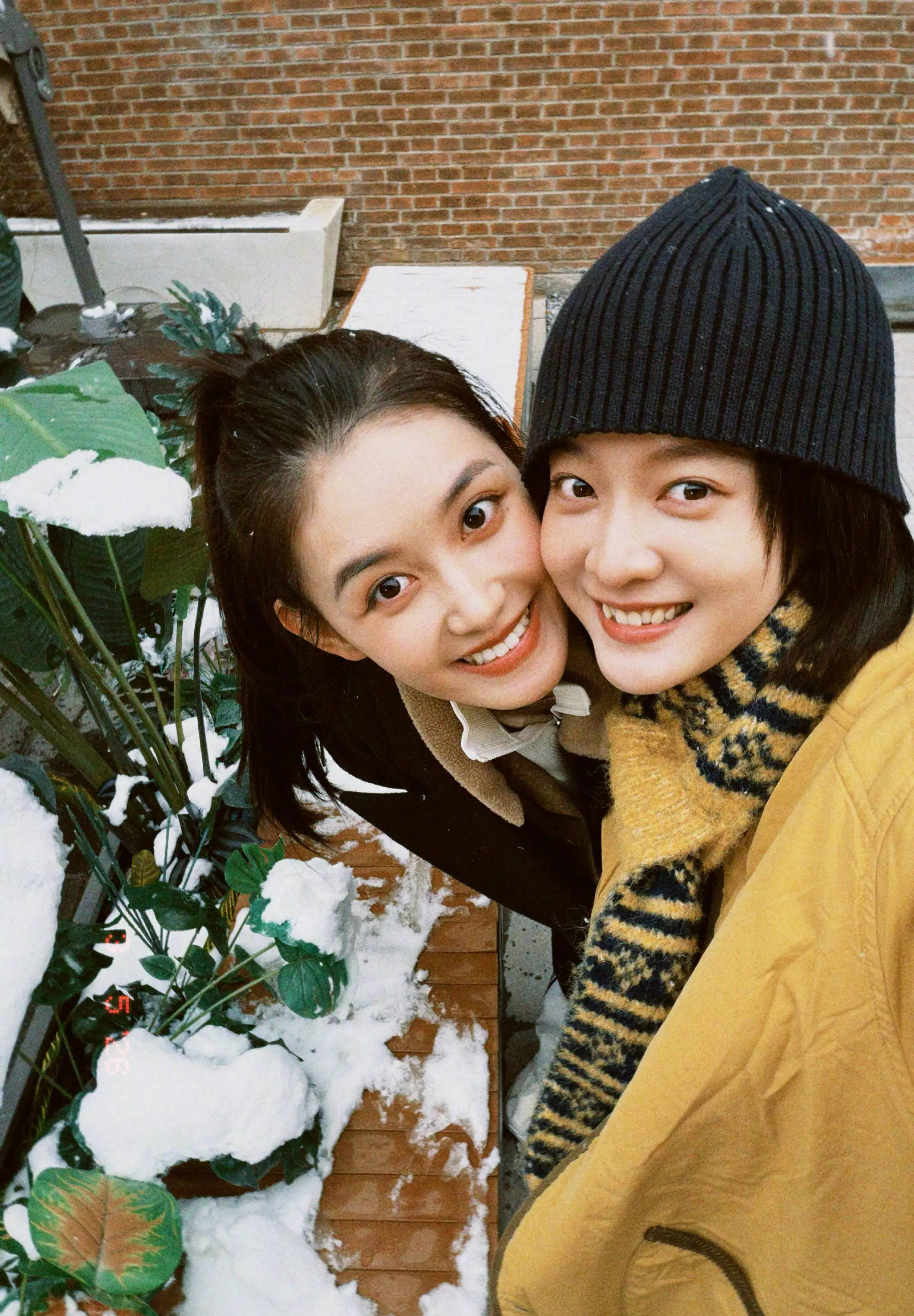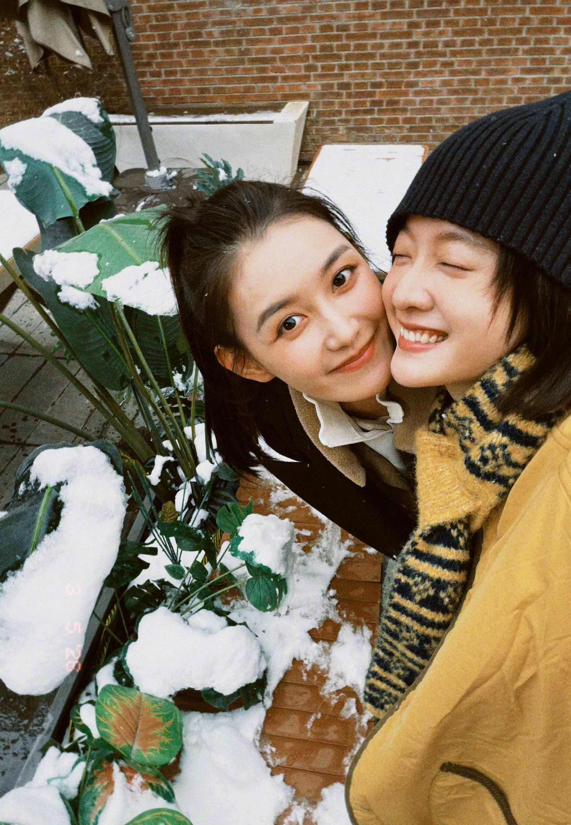 张雪迎与蒋依依在雪地中贴脸合影,闭眼甜笑。