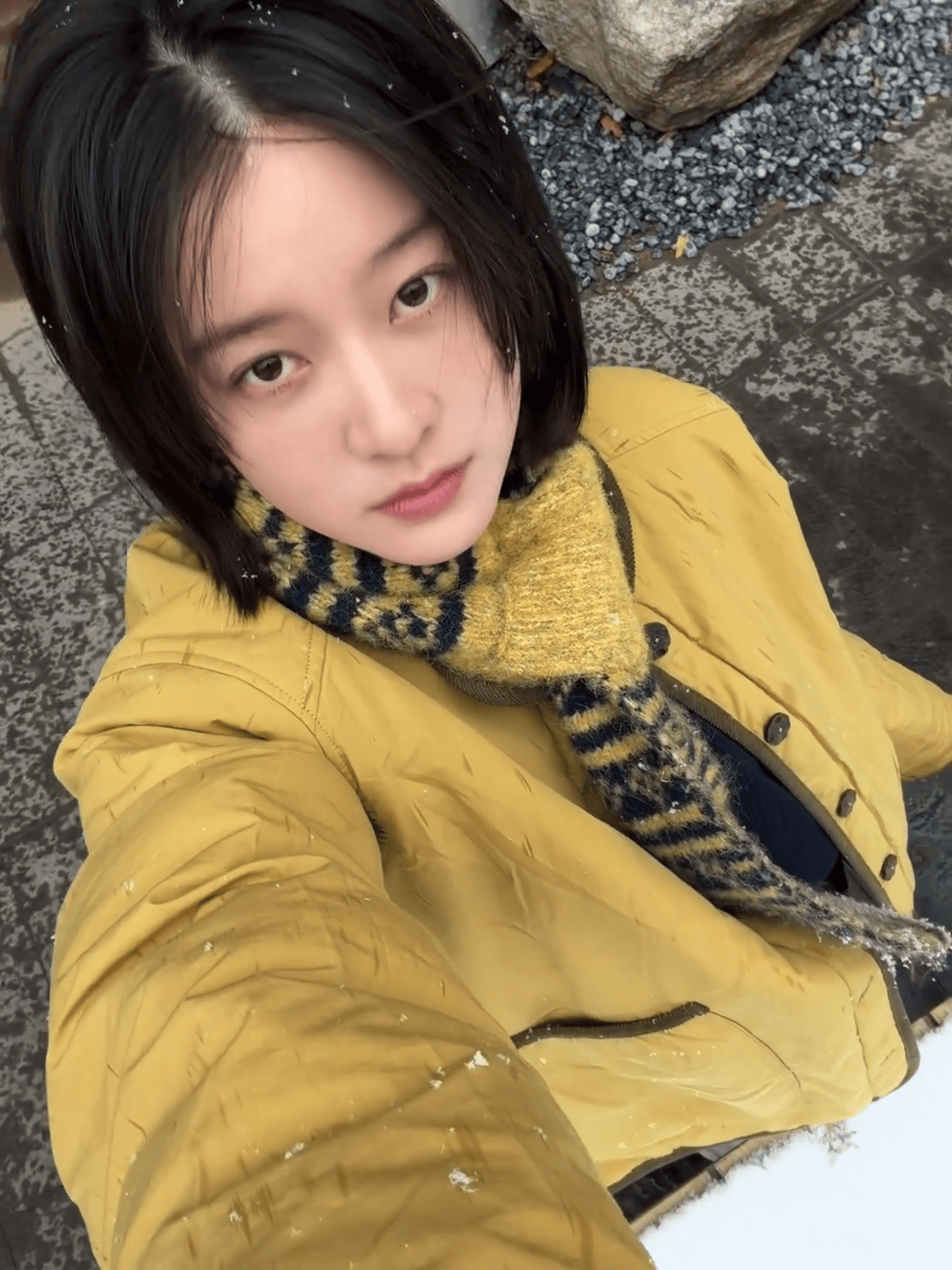 张雪迎身着姜黄色外套与条纹围巾,治愈又元气。