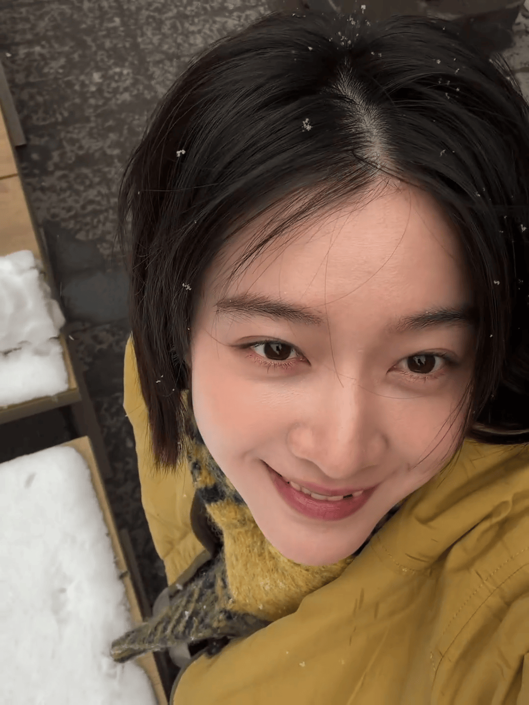 张雪迎在雪地中抬头浅笑,眼神明亮。
