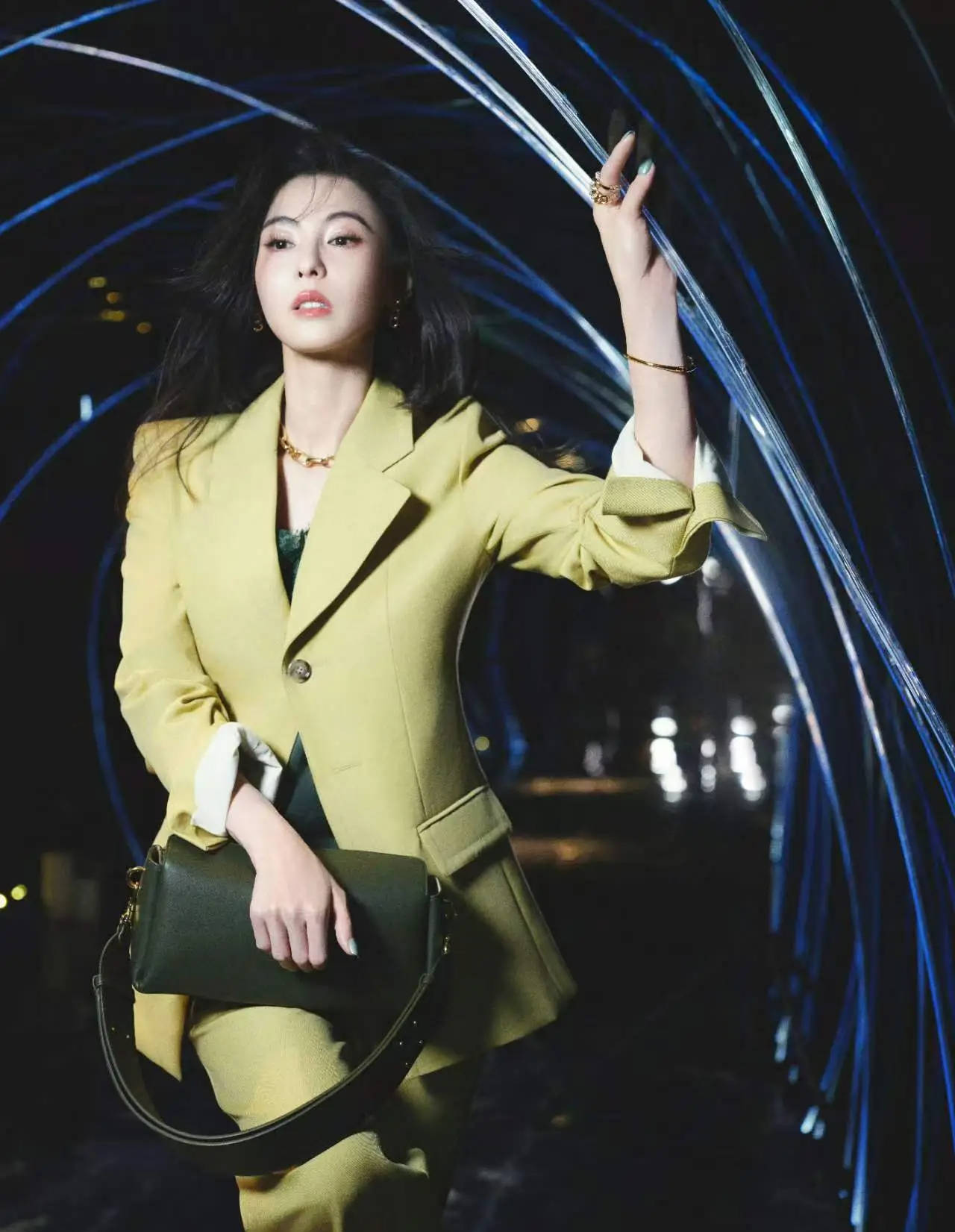 搜狐娱乐讯 近日,张柏芝一组写真曝光。她穿绿色西装套装,配金饰与大波浪卷发,尽显御姐气场。