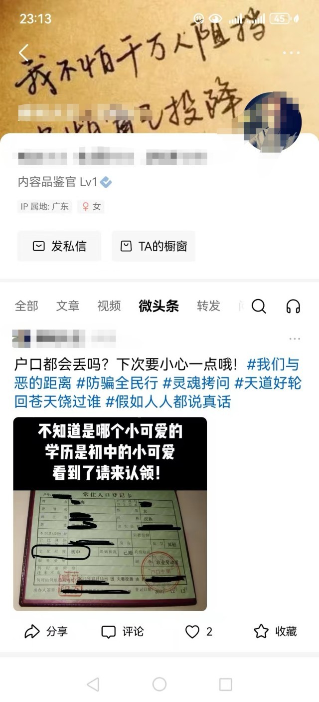 不法分子在平台发布谢某梅户口本信息。受访者供图