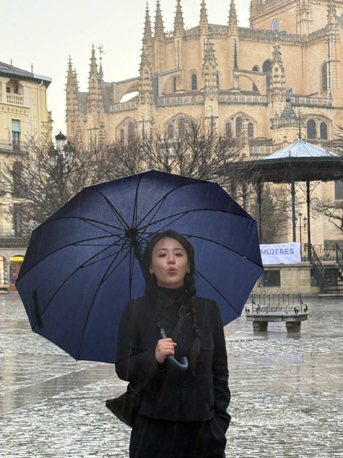 马思纯雨中漫步。