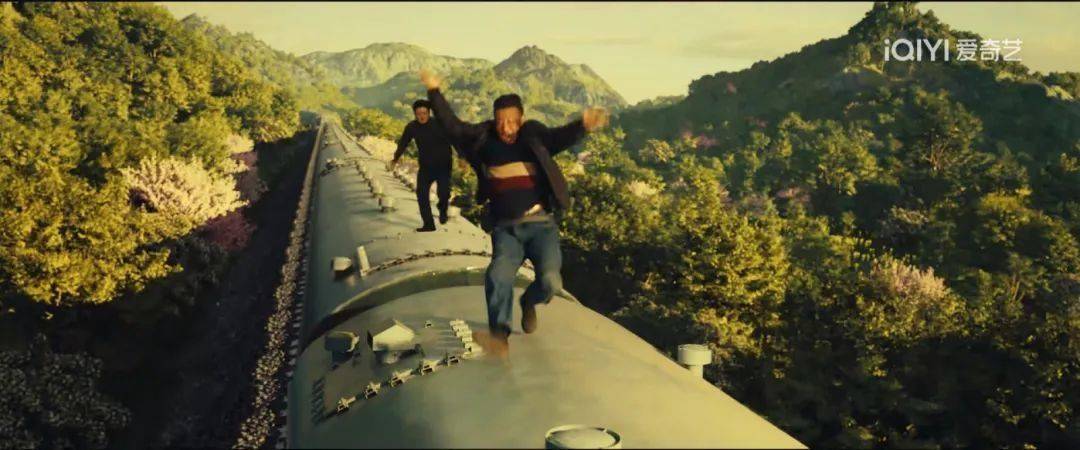 之后团伙果然借机逃窜,主犯冲到火车顶部,郭京飞也跟上去,二人开始火车搏斗,你俩演《碟中谍》呢?