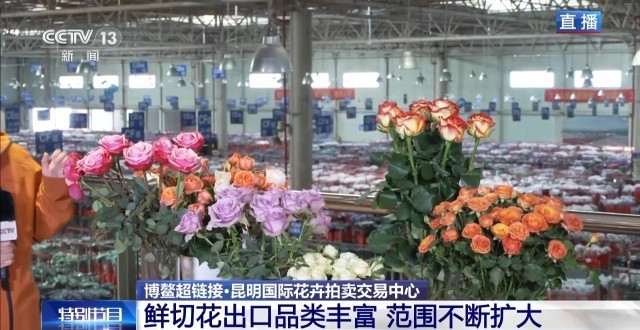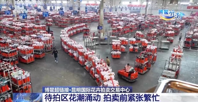 总台记者 伊圣楠:我现在所在的位置是昆明国际花卉拍卖交易中心。此时此刻,我身后的待拍区正在逐渐汇聚成一片流动的花海,工作人员正在进行鲜切花拍卖前的准备工作。